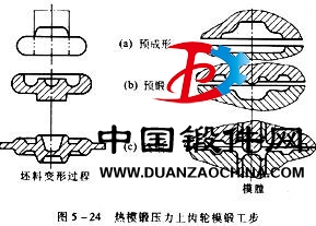 熱模鍛壓力機采用整體床身或有預應力的框架式機身,通過曲柄連桿機構使滑塊往復運動進行模鍛,如圖5—23所示。熱模鍛壓力機滑塊運動,模具有導向裝置(鍛模的上模固定在滑塊上),分為預成形、預鍛、終鍛等工步(圖5—24),每個工 步金屬變形均為一次行程完成,變形較均勻且生產(chǎn)效率高;有頂出機構,鍛件的模鍛斜度可較小,且可直立鐓鍛“頭桿形”鍛件;鍛造力是壓力而非沖擊力,有利于提高金屬塑性。它具有剛性好、鍛件精度高、能安排多模膛模鍛和一模多件、滑塊行程一定、速度低、操作簡單并容易實現(xiàn)自動化生產(chǎn)等特點。但由于熱模鍛壓力機的滑塊行程和速度固定,故不適于拔長和滾壓工步,且設備和模具復雜、造價高,僅適用于大批、大量生產(chǎn)。