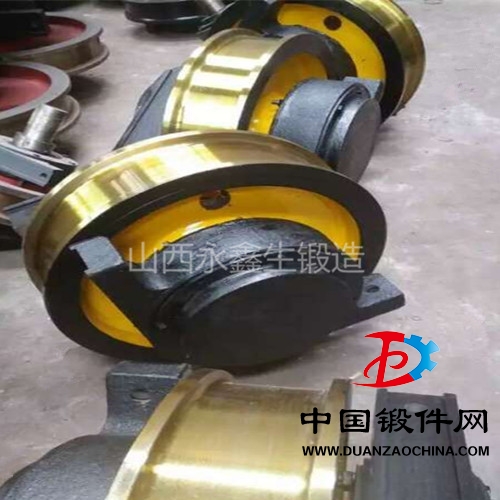 由于起重機車輪組負載比較大,工作條件比較嚴峻。鍛造車輪組是利用鍛壓機械對金屬毛坯使其產生塑性變形,并使其獲得一定的機械性能和形狀。鍛造車輪在鍛造過程中,通過鍛壓能消除金屬在冶煉過程中產生的鑄態疏松等缺陷,優化組織結構,同時保持完整的金屬流線。所以鍛造車輪組的機械性能大大優于同等材料的鑄造車輪。尺寸較大,批量較小的鍛造車輪我們一般采用自由鍛,尺寸較小,批量較大的以模鍛為主。鍛造車輪組一般采用鍛造60鋼 42CrMo65Mn等材質。鍛造車輪在經過鍛壓以后我們要經過正火處理,消除內應力。鍛造車輪是鍛件的一種分類,主要使用于門方式起重機、橋式起重機、礦山機械等。又稱:行車輪,天車輪,輪子鍛件,輕軌車也有應用。車輪組主要由以下幾部分鍛件組成。