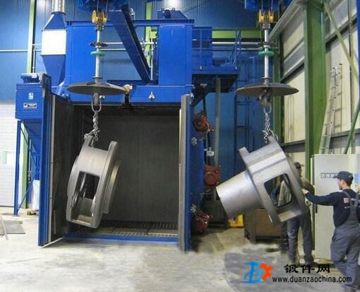另外還有一種非常常見的就是噴丸清理,這主要是讓鍛件放置在一些噴丸的小車當中,對于任何的鍛件來說都比較適用,這種的優(yōu)點就是生產(chǎn)率非常的高,而且勞動條件會比較好。但是同樣也存在一些比較大的缺點,就是噪音非常的大,一般像是在鍛件的表面當中可能會打出一些印痕時的表面加工硬化,同時也會使得邊緣出現(xiàn)損壞的情況。
