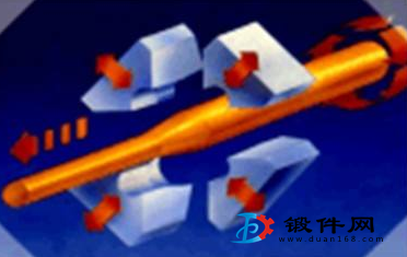 鍛件徑向鍛造時(shí),在垂直于棒(管)料的軸線的平面上,用幾個(gè)錘頭(通常是3個(gè)或4個(gè)錘頭),從幾個(gè)方向?qū)Π?管)料進(jìn)行對(duì)稱的、高頻率的同步打擊,如圖所示。