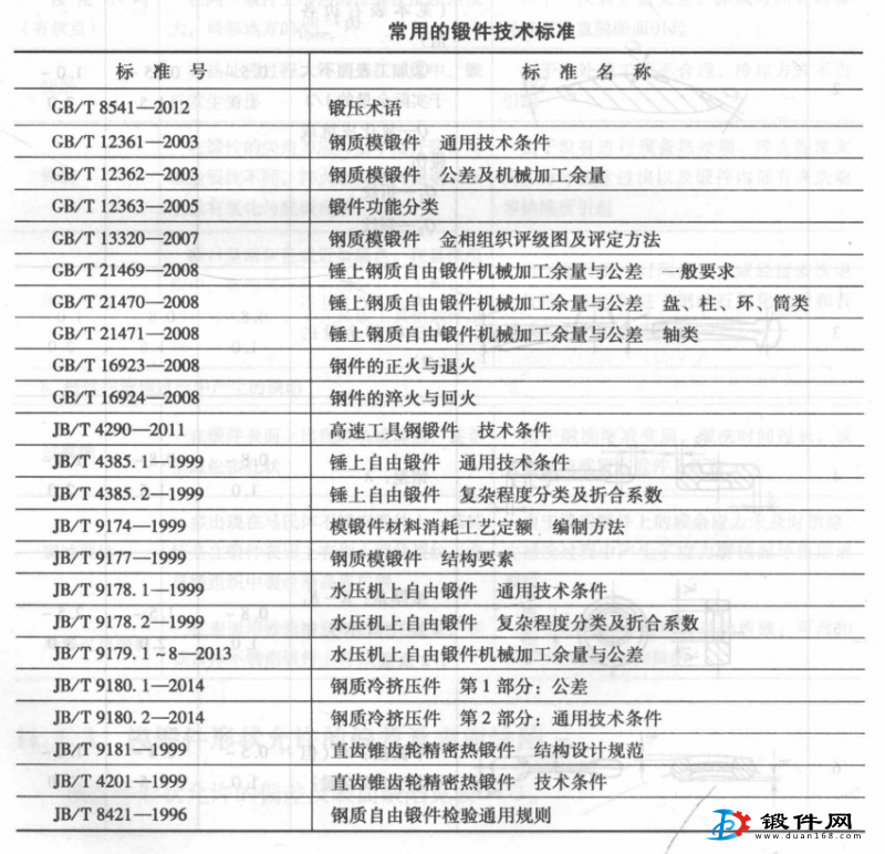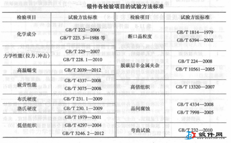 鍛件質(zhì)量檢驗(yàn)的目的,在于保證鍛件質(zhì)量符合鍛件的技術(shù)標(biāo)準(zhǔn)。常用的鍛件技術(shù)標(biāo)準(zhǔn)見下表。鍛件質(zhì)量檢驗(yàn)的內(nèi)容包括:鍛件幾何形狀與尺寸的檢驗(yàn)、表面質(zhì)量的檢驗(yàn)、內(nèi)部質(zhì)量的檢驗(yàn)、力學(xué)性能檢驗(yàn)及化學(xué)成分檢驗(yàn)等方面。