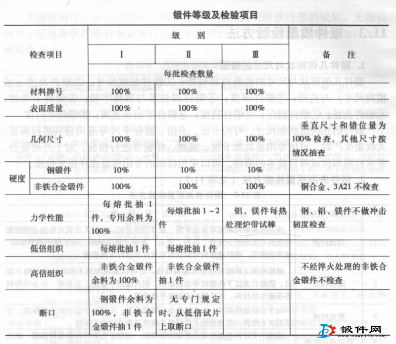鍛件的等級(jí)不同,所需進(jìn)行的具體檢驗(yàn)項(xiàng)目和要求也不同。鍛件的等級(jí)是按照零件的受力情況、工作條件、重要程度、材料種類和冶金工藝的不同來劃分的。各工業(yè)部門對(duì)鍛件等級(jí)的分級(jí)不盡相同,有些部門將鍛件分為三級(jí),有的分為四級(jí)或五級(jí)。鍛件分為三級(jí),并指出了每一級(jí)的檢驗(yàn)項(xiàng)目。為鍛件各檢驗(yàn)項(xiàng)目的試驗(yàn)方法標(biāo)準(zhǔn)。對(duì)于某些有特殊要求的鍛件,還須按專用技術(shù)條件文件規(guī)定進(jìn)行檢驗(yàn)。