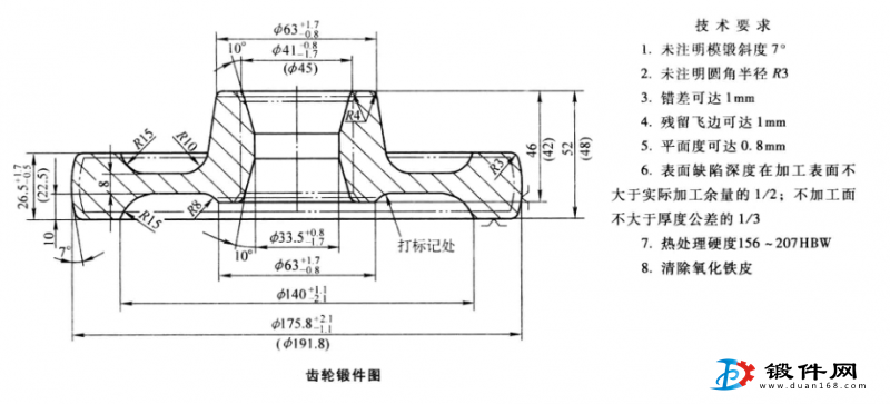 某一齒輪鍛件的外徑為171.8mm,全高48mm, 計算其鍛件質量4.63kg,包容體質量為10. 18kg,形狀復雜系數為S3級,材料牌號180CrMnTi,0材質系數為M1級;精度等級為普通級。由圖中鍛件的機械加工余量及公差繪制出鍛件圖。由于需方未提出特殊要求,其技術要求按一般鍛件質量要求列于鍛件圖下方。