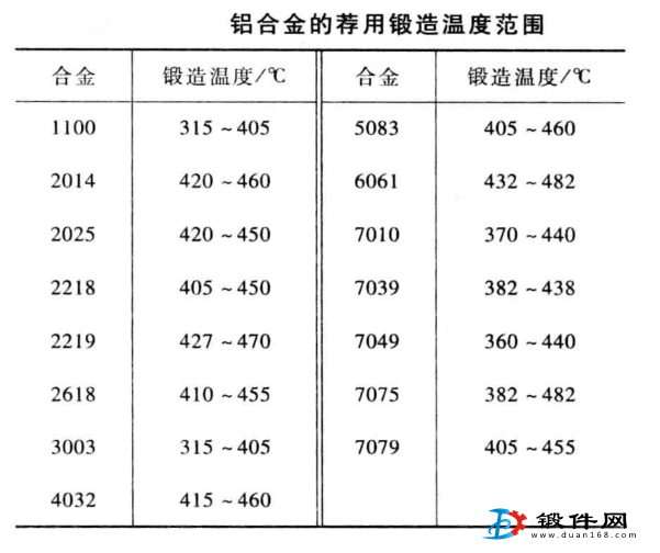 美國15種最常用的鍛造鋁合金的薦用鍛造溫度范圍列列于表中。它們很適合于模鍛,表列上限溫度大約低于各種合金凝固溫度70℃。大多數合金的鍛造溫度范圍是相當窄的(一般小于55℃),而且沒有一個合金的溫度范圍大于85℃。和相比較,始鍛溫度被降低,終鍛溫度被提高,在較窄的溫度范圍內鍛造,無疑合金的塑性好,變形抗力較小,所得再結晶組織也均勻、細小。為了保證鋁合金鍛件的鍛造溫度變化很小,鋁合金鍛造用模具必須經過很好的預熱。