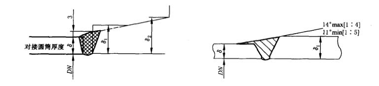 ①乙型平焊法蘭的短節(jié)厚度或長頸對(duì)焊法蘭的直邊厚度和與其連接的圓筒厚度不等時(shí):若圓筒厚度不大于10mm,且與短節(jié)或長頸直邊厚度差超過3mm;若圓筒厚度大于10mm,且與短節(jié)或長頸直邊厚度差大于筒體厚度的30%或超過5mm時(shí),乙型平焊法蘭應(yīng)按斜率1:3、長頸對(duì)焊法蘭按圖虛線削薄,或者在對(duì)接焊縫的筒體端部按圖中堆焊過渡。