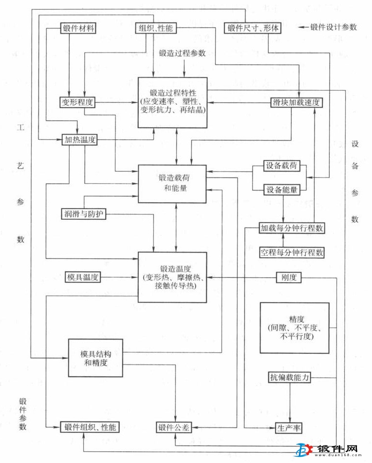 鍛件、工藝和設備之間的因果關系可用鍛件設計參數、鍛造工藝參數和設備參數及其鍛造過程中的相互作用框圖作定性描述。