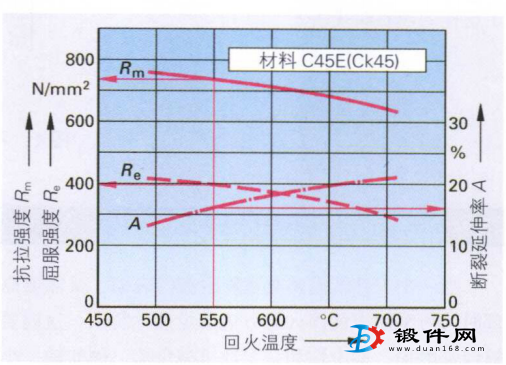 舉例:調質鋼C45E回火至550℃可達到如下機械性能:抗拉強度ftm=730 N/mm2,屈服強度扎=390 N/mm2, 斷裂延伸率A=16%。