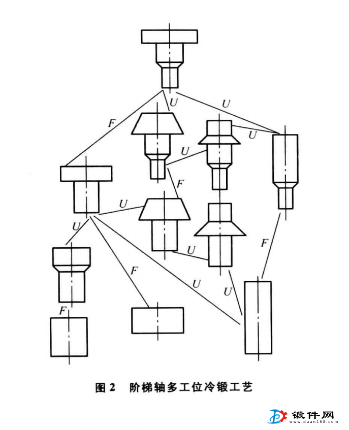 又如階梯軸多工位冷鍛(見圖2),對于同一鍛件可以有不同的工藝路線,采用不同的毛坯,相應地 中間工序也不相同,有些包含正擠壓(圖中F),有 些采用頂鐓(圖中U)0所需變形力大小也不等。模 具壽命差別也較大。