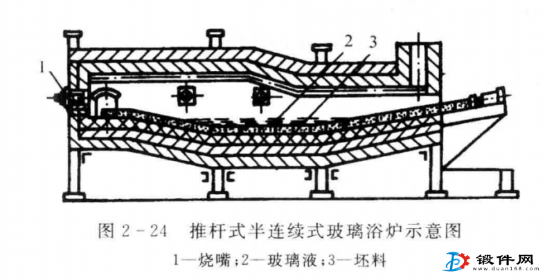 圖2-24所示為推桿式半連續(xù)玻璃浴爐。爐中加熱段凹形爐底內(nèi)熔有高溫玻璃液,鍛造坯料連續(xù)推過玻璃液后便被加熱,由于玻璃液的保護(hù),加熱過程中坯料不會(huì)氧化,并且,坯料推出玻璃液后,在表面附著一薄層玻璃膜,它不但能防止坯料產(chǎn)生二次氧化,還可在鍛造時(shí)起潤(rùn)滑作用。這種方法加熱快而均勻,防止氧化和脫碳效果好,且操作方便,是一種有前途的少無氧化 加熱方法。