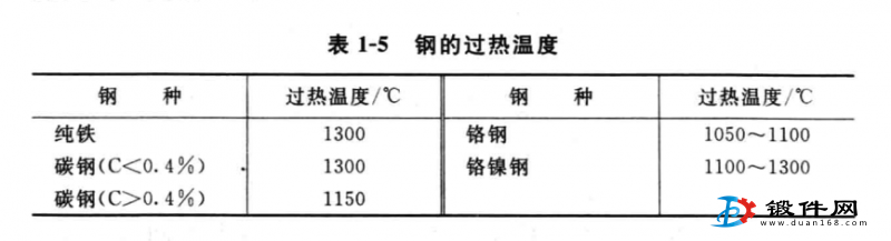 不同鋼種對過熱的敏感程度不同,軟碳鋼對過熱的敏感性最 小,而合金鋼則容易過熱,在對過熱敏感的鋼種中,以鐐銘鑰鋼最 為突出,見表1-5。