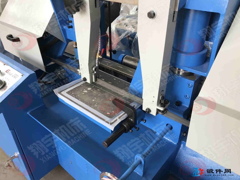 根據切割角度要求分為角度鋸床(能鋸切角度90度45度)無角度即90度垂直切割。1、鋸切角度調整:如要鋸切45度角內任一角度時,先放松固定把手,然后將鋸弓順時針方向推轉,對準本座上之角度標尺上您所需要的角度刻度上,在鎖緊固定把手。2、當您調整好鋸切角度時,小虎鉗角度亦需跟著調整放松虎鉗固定螺絲,再將小虎鉗推向大虎鉗,使小虎鉗與大虎鉗角度相同,在鎖緊固定螺絲后即可。