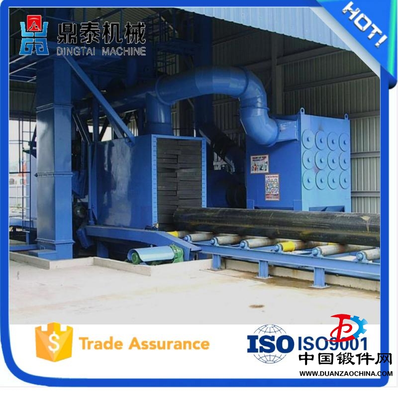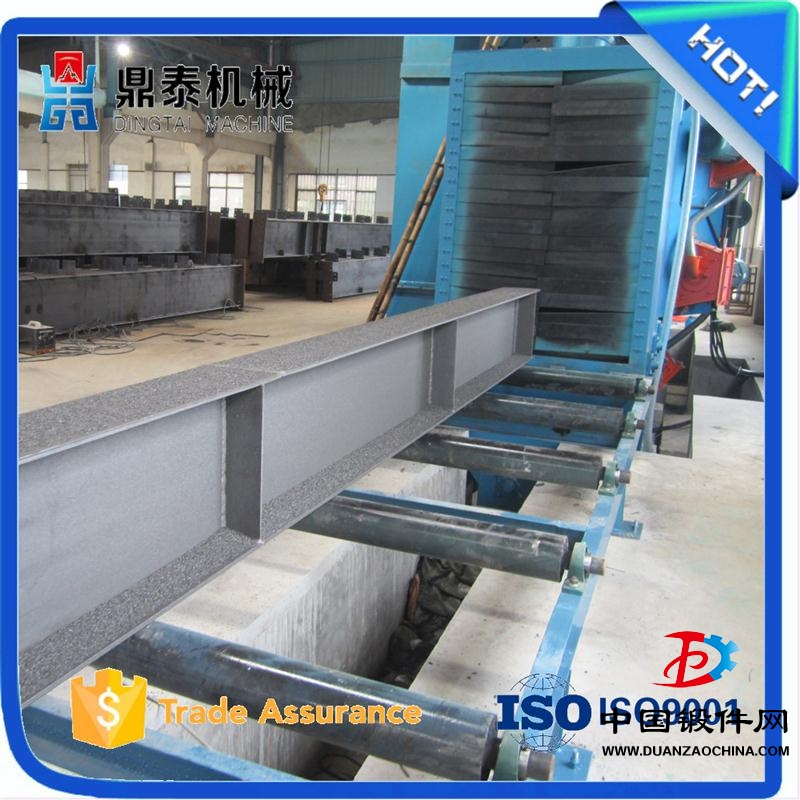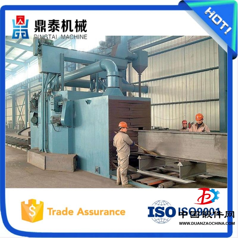 鋼結構拋丸除銹機,清理過程中由電氣控制的可調速輸送輥道將鋼結構件或鋼材送進清理機室體內拋射區,其周身各面受到來自不同坐標方位的強力密集彈丸打擊與磨擦,使之其上的氧化皮、銹層及其污物迅速脫落,鋼材表面就獲得一定粗糙度的光潔表面,在清理室外兩邊進出口輥道裝卸工件。落入鋼材上面的彈丸與銹塵經吹掃裝置吹掃,撒落下來的丸塵混合物由回收螺旋輸送到室體漏斗、縱橫向螺旋輸送機匯集于提升機下部,再提升到機器分離器里,分離后的純凈彈丸落入分離器料斗中內,供拋丸循環使用。拋丸清理中產生塵埃,由抽風管送向除塵系統,凈化處理后的凈氣排放到大氣中,顆粒狀塵埃被捕捉收集。