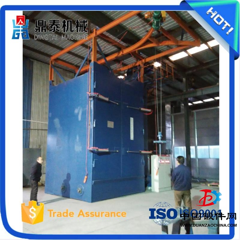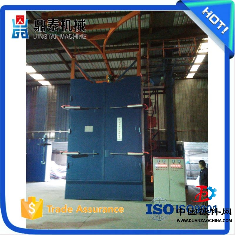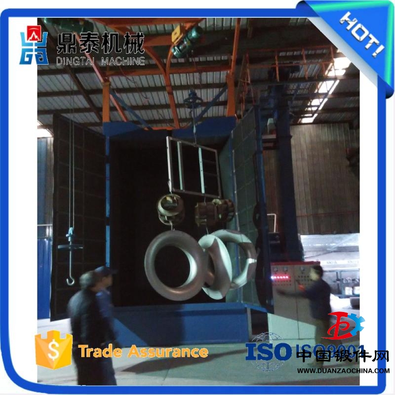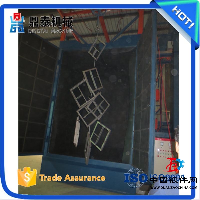 自動:需拋丸處理的工件直接懸掛在吊鉤或掛架上,人工帶至拋丸室前部的牽引系統,吊鉤自動進入拋丸室。吊鉤進入拋丸室后,拋丸室門將氣動關閉,電氣聯鎖,以避免工件在拋丸室內進行拋丸處理時他人誤開拋丸室門。吊鉤進入拋丸室在設定的區間位置作來回往復運動和自轉,使工件受到充分拋射,減少拋射死角。二個吊鉤、一個吊鉤在拋丸室內拋射,另一個吊鉤可裝卸工件。拋丸處理的時間可任意調整。拋丸器停止運轉后拋丸室門打開,以帶進和帶出工件。拋丸處理中產生的粉塵由二級除塵器過濾排放。